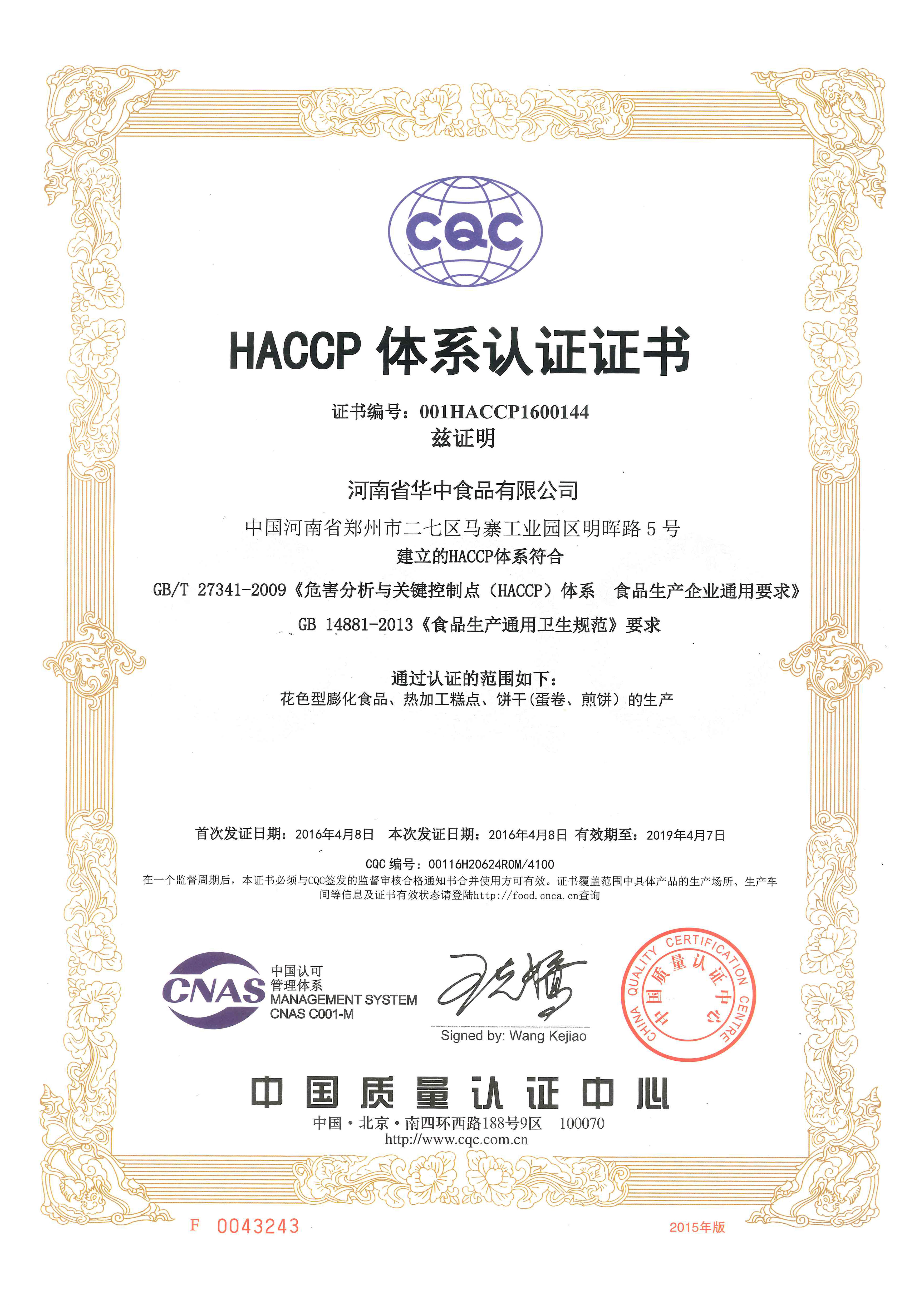 日,華中食品集團通過HACCP認證,為拓寬集團產品銷售渠道提供了有力的支撐。